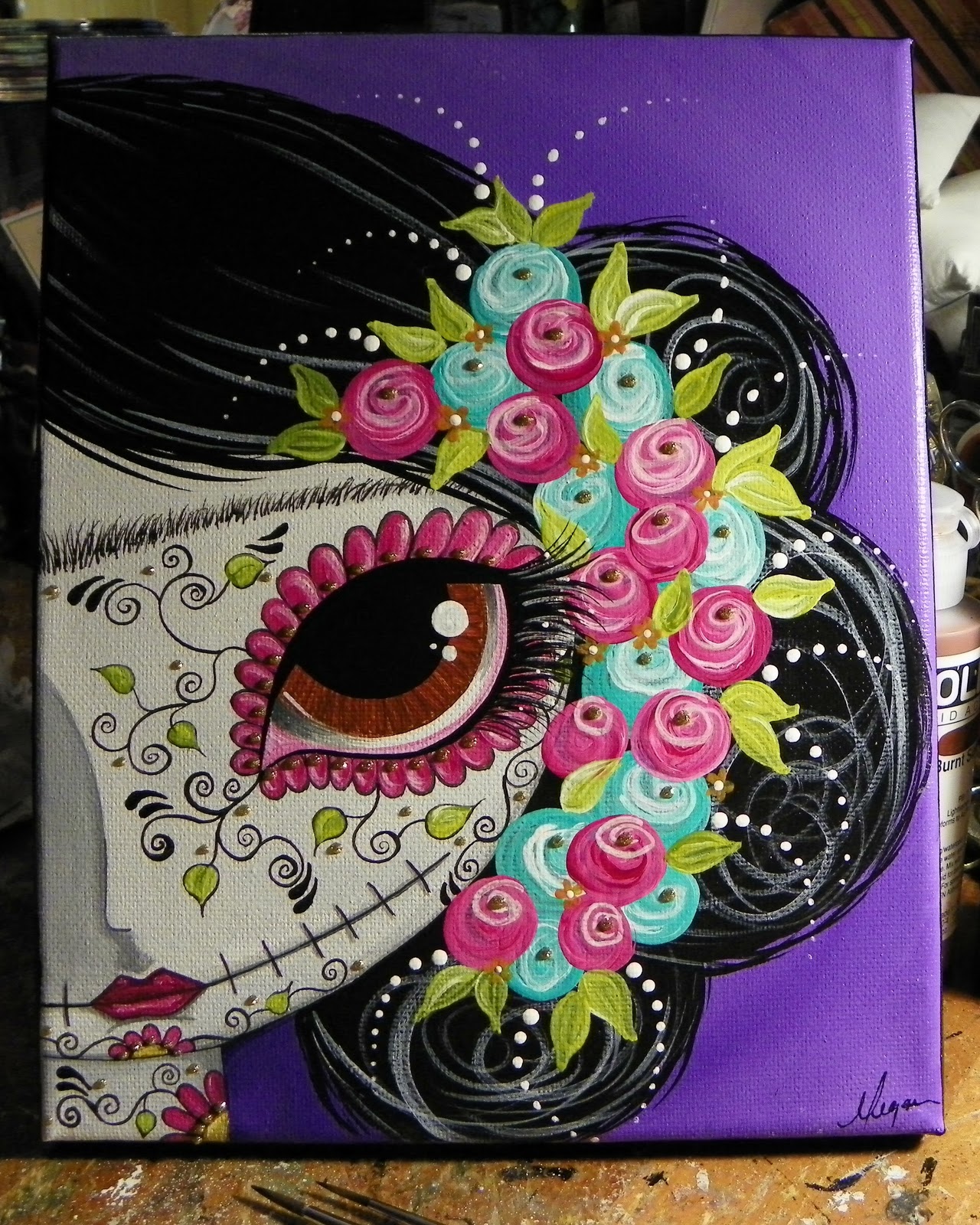This is my newest painting Frida Kahlo~Día de los Muertos. It measures 12x12 on stretched canvas. I am so thrilled with this one! It's one of those paintings that I was completely absorbed into. Everything else around me faded out & it was just me & the paint! I went to bed feeling very calm & satisfied with myself :) I hope you all enjoy her :) I just posted her to my facebook page for auction. It will go until Sat. at midnight!
